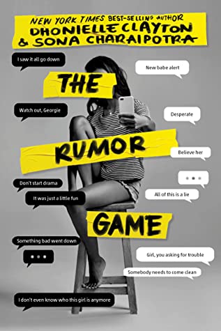 Yellow Tape on top of light grey cover, depicting the words "New York Times Best-Selling Author Dhonielle Clayton and Sona Charaipotra". Below a girl in black and white sits on a stool holding a phone out in front of her with more yellow tape covering identifying features that depicts the title "the rumor game". She is surrounded by text bubbles depicting rumours.